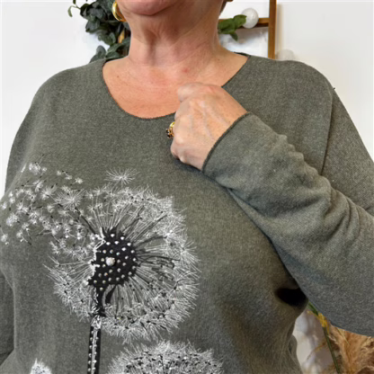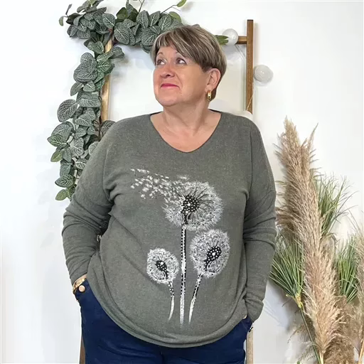 Ce pull fond uni de fabrication italienne pour femme est proposé avec son imprimé pissenlits sur le devant. Proposé en taille unique il conviendra du 42 au 48 en fonction des différentes morphologies. Ce pull coupe droite est confectionné en maille un tissu doux et chaud sans être trop épais rendant ce dernier idéal pour les saisons fraîches. Il présente un col V, et des finitions cousues. Le Must Have de cette année 2025.
