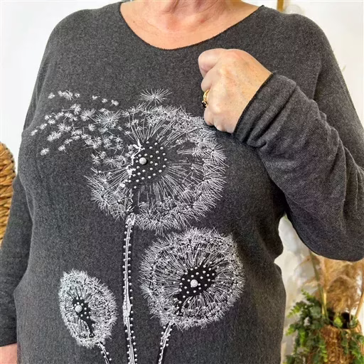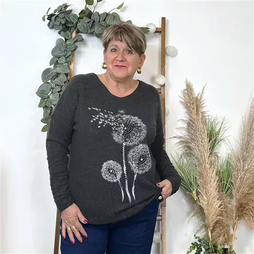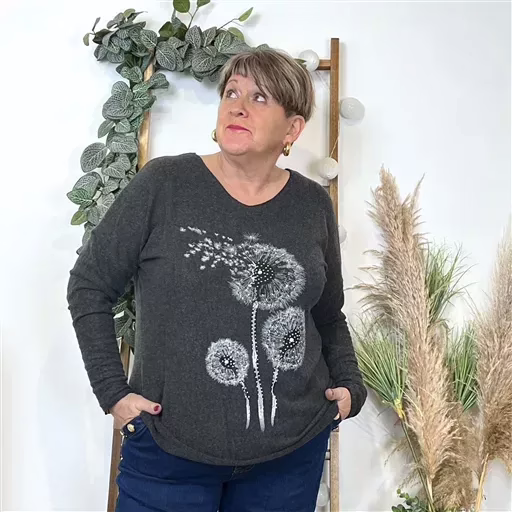 Ce pull fond uni de fabrication italienne pour femme est proposé avec son imprimé pissenlits sur le devant. Proposé en taille unique il conviendra du 42 au 48 en fonction des différentes morphologies. Ce pull coupe droite est confectionné en maille un tissu doux et chaud sans être trop épais rendant ce dernier idéal pour les saisons fraîches. Il présente un col V, et des finitions cousues. Le Must Have de cette année 2025.