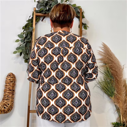 Un bel imprimé “Graphique” pour cette blouse signée Christy qui se porte facilement en cette saison. Blouse fluide imprimée “Jolies Formes”, ravissante aux manches longues avec finition poignets et lien pour remonter les manches. Encolure en V. Encolure bien dégagée, fermée par 3 boutons. Forme droite. Facile à associer avec nos pantalons Confort JST, nos jeans Voggo à 18.90€ ou nos pantalons C’Mélodie.