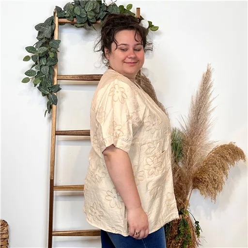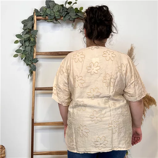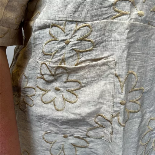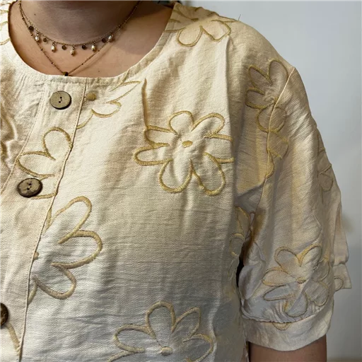 Découvrez notre tunique au fond uni et aux larges marguerites brodées. Sa coupe droite, son encolure ronde créent une silhouette fluide et féminine. Les trois boutons fantaisie sur le devant ajoutent une touche d’originalité. Parfaite pour un look bohème chic, cette tunique se porte aussi bien avec un jean qu’avec une jupe longue.